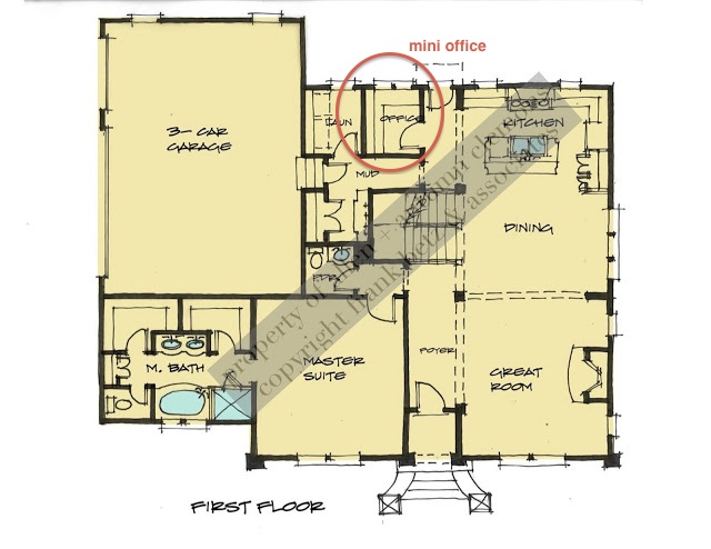 we ended up getting more room in the master suite than we anticipated, but the office ended up being a little smaller. it is approximately 7' x 7'...NOT huge. i have affectionately nicknamed it my mini office. the office will need to house our family computer and printer, storage for bills and important documents, as well as office supplies, some books, and most of my fabric and wallpaper samples.